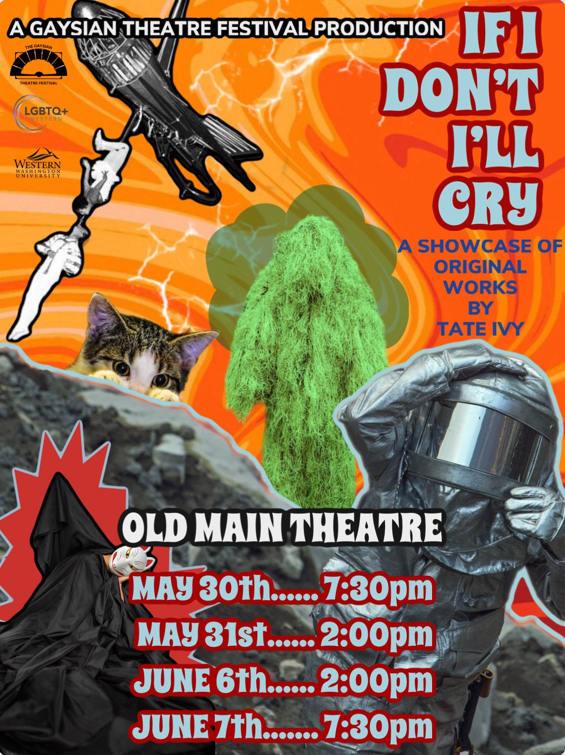 “If I Don’t, I’ll Cry” is a premiere showcase of short performances written and directed by Tate Sakura Ivy. Tate is a senior theatre production student at WWU graduating this spring.This capstone showcase includes several short plays and a dance piece with a shared theme revolving around identity and coping mechanisms. From stoner comedy to sleep demon dance to volcanologist drama, this performance will give you queer joy, queer angst, and all of the feelings that come with being queer. “If I Don’t, I’ll Cry” will debut at WWU’s Old Main Theatre May 30th at 7:30pm with subsequent performances May 31st at 2pm, June 5th at 7:30pm, and June 7th at 7:30pm.